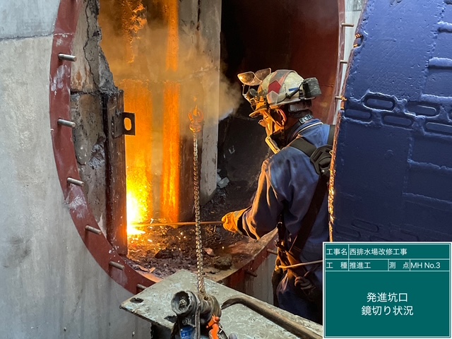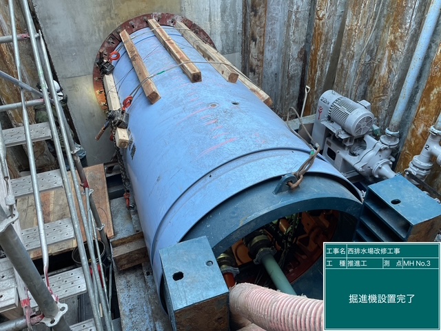 軟弱地盤での推進ですが、到達手前に擁壁基礎の捨石があるためにローラービットでの施工となりました。無水地盤のため逸泥が考えられるので、隣接する工事用水池に浸透させないよう、可塑剤を管周囲に満遍なく充填しました。到達まで計画通りに慎重に推進を行ったので、問題なく到達することができました。